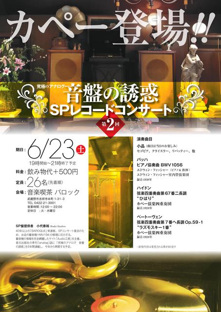 東京都武蔵野市にある音楽喫茶バロックは、第2回目となる「音盤の誘惑 SPレコードコンサート」を今週末6月23日(土)に開催する。