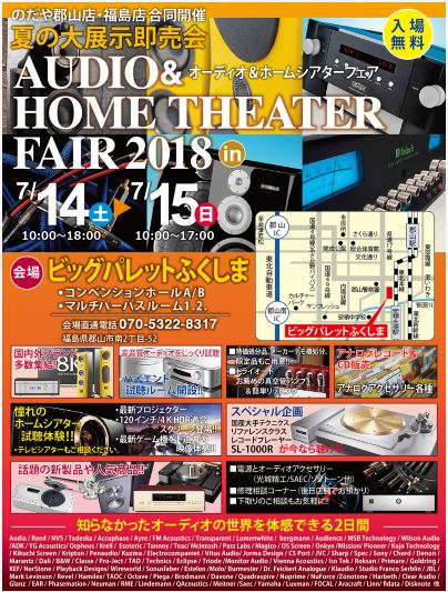のだや郡山店と福島店が合同主催する「オーディオ&ホームシアターフェア 大展示即売会」が、今週末の7月14日(土)、15日(日)に開催される。