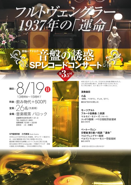 東京都武蔵野市にある音楽喫茶バロックは、 “第3.5回”「音盤の誘惑 SPレコードコンサート」を、今週末8月19日(日)に開催する。