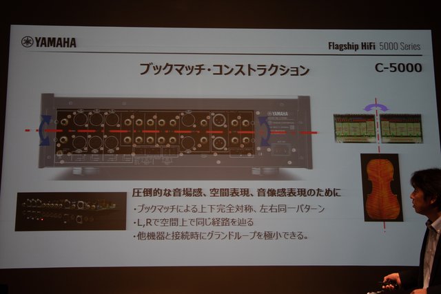 「C-5000」では、全てのオーディオ回路とそのグラウンドライン、各段へ給電を行うローカル定電流型電源レギュレーターをL/Rごとに1枚の大型基板に配置(片チャンネルあたり1枚)。このL/Rのオーディオ基板を背中合わせに重ねて上下に配置した「ブックマッチ・コンストラクション」を採用する(本の両開きのイメージで2枚の基板が配置されているのでブックマッチなのだそうだ)。この構成は、バイオリンやギターの構造からヒントを得ているとのこと。