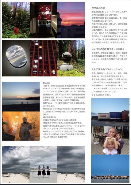 日比野さんは、岩松了さんと竹中さんとの舞台「竹中直人の会」(1992年〜2002年の間)で舞台美術を手がけ、竹中さんの監督映画では題字も書いているという間柄。2人の異なる感性でどんなフォトストーリーが展開されるのか? そして個性溢れる変幻自在なクリエイターである竹中さんが、どんな写真を日ごろ撮影しているのか? 大変興味深い内容である事は間違いない。ぜひ、足を運んでいただきたい。