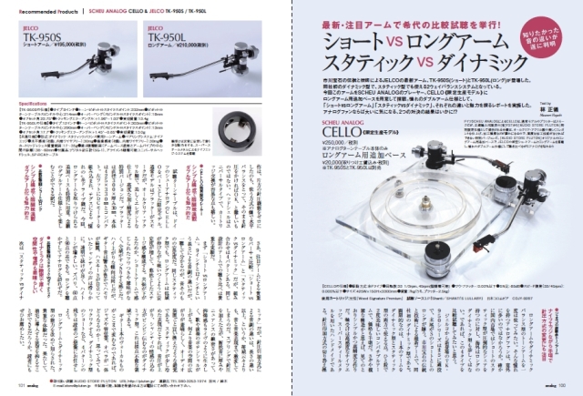 『季刊analog 』誌の最新号vol.61(9月発売)では、特集「トーンアームを知る」の一環として、市川宝石(株)によるアナログブランド「JELCO(ジェルコ)」の最新型トーンアームを使用した特別企画「最新・注目アームで希代の比較試聴を挙行! ショートVSロングアーム スタティックVSダイナミック〜知りたかった音の違いが遂に判明」を掲載している。