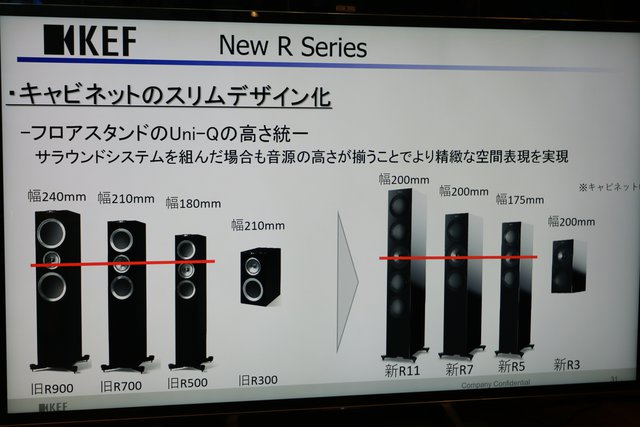 発表会では、従来モデルからの進化ポイントについても解説。上記のような進化はスペックにも現れており、各モデルで高低の両域にわたって周波数帯域を伸ばしている。-6dBでの周波数特性は、R900が35Hz〜45kHzだったのに対して、R11では30Hz〜50kHzとなった。