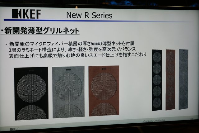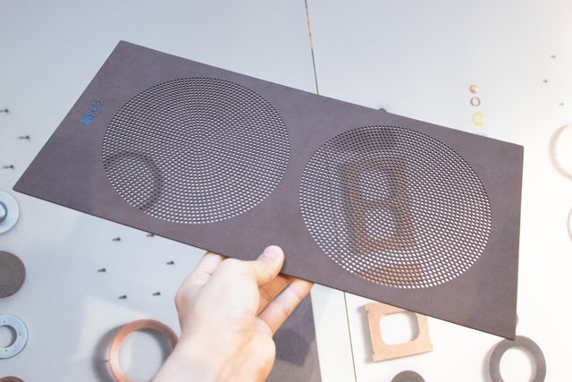 マイクロファイバー積層板を用いた独特の質感のグリルネットが付属。複合材料による13層積層構造となっており、スピーカー部には約1,800個の孔がパンチングされている。エッジは皮革製品と同じ手法で磨き上げることで、スエードのような質感を得ているとのこと。