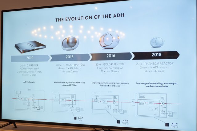 ADH(Analog Digital Hybrid)はアナログ増幅段とデジタル増幅段を組み合わせた同社特許技術のアンプ。本作には最新のADH「v3」チップが搭載される。v1ではASICが統合され、v2ではDAC、v3ではDSPと機能が次第に統合されてきており、この統合も本作の実現に貢献しているとのこと。そして小型化されても性能は同じという。