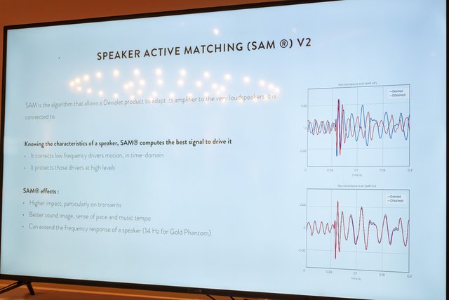 SAM(Speaker Active Matching)は、独自の数学モデルを用いてスピーカー駆動を正確に管理して、アンプおよびユニットの性能を限界まで引き出す技術で、本機にはv2が搭載。これにより、音源のシグナルと同じものをスピーカーで再生することが可能になり、もともと録音されていたものやアーティストが考えていたものを再生できるとする。