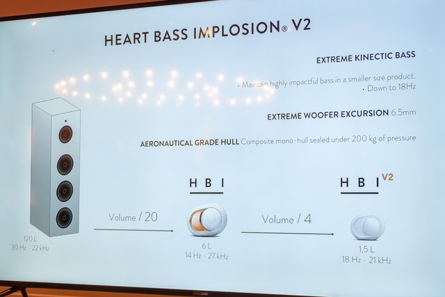 本機には向かい合うように2つのウーファーが配置されているが、PHANTOMの16インチ・ウーファーと比べて小径のものが搭載されている。小径化されても同等の低音再生を図るため、HBI v2では振動の最大ストロークがより大きく設計された。また、PHANTOMでは正面にミッドレンジとトゥイーターが同軸配置されているが、本作では小型化のため、中高音を担当するフルレンジドライバーが1基搭載されている。また振動板の材質は、ともにアルミニウム製となる。