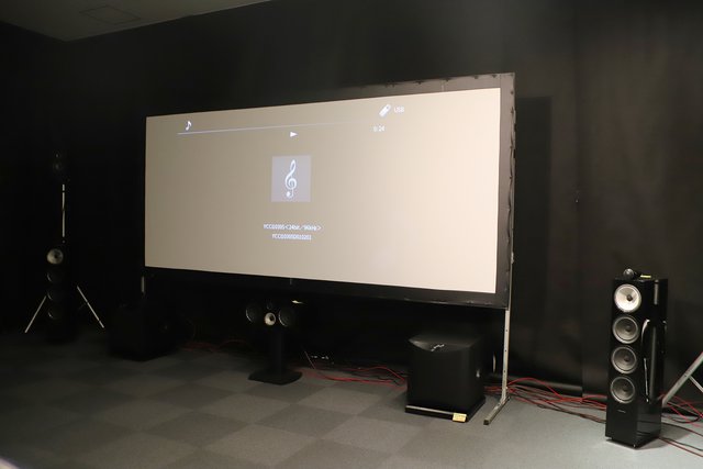RoomEはシアターシステムの提案。12月1日から4K8K放送もスタートしたということもあり、高画質への需要は確実に高まってきている。7.2.4chのDolby AtmosやJVCの8Kプロジェクターなどは特に高い関心が寄せられていた。スピーカーにはB&Wを用意し、サブウーファーにはヤマハのNS-SW1000を2台使い、作品世界への没入感を高めていた。デモには「ブレードランナー2049」や南壽あさ子の音源などが用いてシステム提案が行われた。
