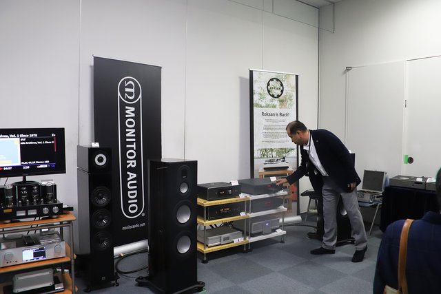 ナスペックは、オーディオ銘機賞で特別大賞を受賞したPlayback DesignのDREAMシリーズを中心に、ROKSANのアンプ、モニターオーディオのGOLD300をデモ。今回のフェアの中でも特に高品位な音を鳴らしていたブースのひとつで、セパレートSACDトランスポート+DACという非常に高価な組み合わせであるが、まさにスピーカーが消え、目の前に音だけが展開するような世界を実現。ROKSANのBLAKシリーズはプリアンプとCDプレーヤーは来年発売予定のフラッグシップモデルとのこと。