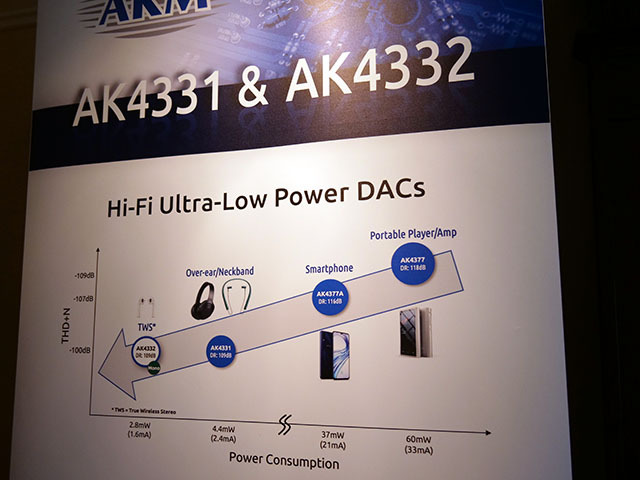 そのほかオーディオ系製品では、超低消費電力DAC「AK4332」にも注目したい。完全ワイヤレスイヤホンにも使える消費電力2.8mWを実現した製品で、ダイナミックレンジも109dB(モノモード時)を確保している。