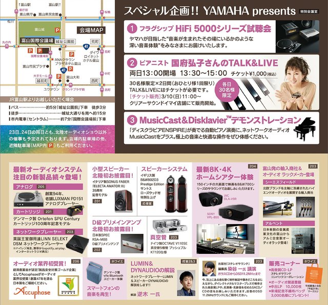 またYAMAHAのスペシャル企画として、“HiFi 5000シリーズ”の試聴会、ピアニスト国府弘子さんのトーク&ライブ(チケット 1,000円税込)、MusicCastとの連携によるハイブリッドピアノDisklavierの自動演奏が実施される。