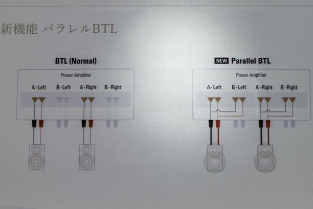 通常の接続で利用できるということで、「デフォルトでパラレルBTLとなる設定でもいいのではないか」という意見もあったという。ただし、電源自体は同じなのでパラレルBTL駆動時にはスペック上の出力が下がることもあり、デフォルトは標準のBTLにしたという。