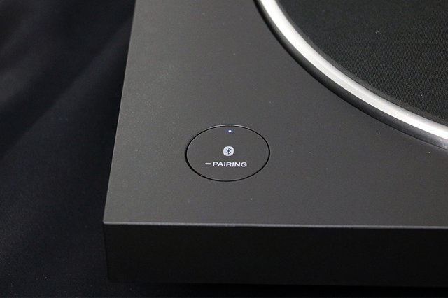 テーブル部左側にBluetoothボタンを搭載。接続状況を表すLEDライトを備え、未接続時にはオレンジ、ペアリング中はブルーに光る。なお、Bluetooth機能停止時はライトは消灯となる。再生機器は最大8台まで登録可能で、一度ペアリングすれば、次からは自動的にペアリングされる。