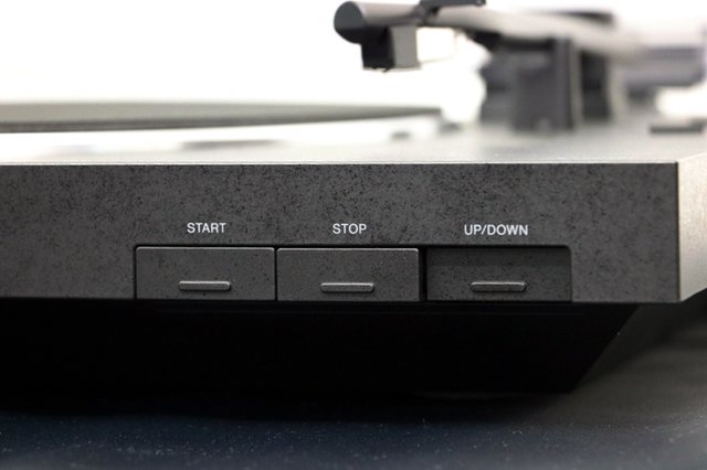 本体手前側にはスタート、ストップ、アップ/ダウンと3つのボタンを装備。アップ/ダウンではトーンアームの上下、スタートとストップはオート再生/停止が行える。なおレコードの再生が終了すると自動でトーンアームが上がり最初の位置に戻る。