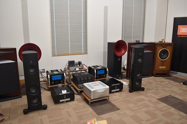 例えばエレクトリとハーマンインターナショナルとエソテリック、エイ・アンド・エムが出展するBルームでは、アヴァンギャルドとタンノイ、JBL、マジコのスピーカーが同じ場所に設置。その間には、マッキントッシュとマークレビンソン、エソテリックとエアタイトのアンプが林立。アヴァンギャルドのスピーカーをマッキントッシュのアンプとメトロノームのCDプレーヤーで鳴らし、その操作をエソテリックの担当者が行う。