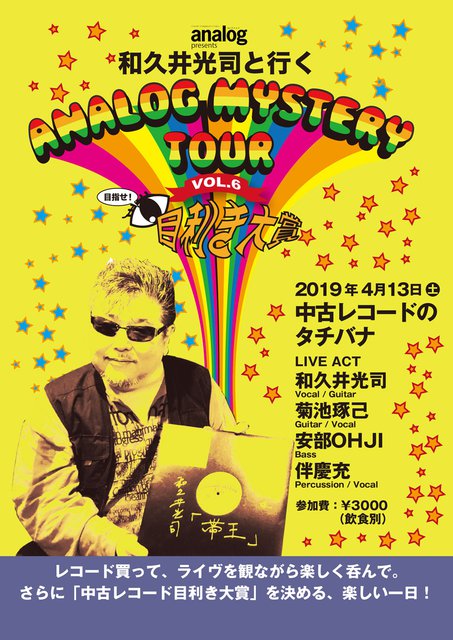 いよいよ間近となった4月13日(土)開催の季刊 アナログ誌によるイベント、「和久井光司と行くアナログ・ミステリー・ツアー vol.6」。二部制となる本イベントの第一部は会場となる横浜市青葉区の老舗「中古レコードのタチバナ」でレコードハンティング。そして第二部は隣接するカフェ「ウチルカ」にて、和久井光司バンドのライヴと第一部で購入したレコードの品評会を開催し、楽しく飲んで食べながら「本日の目利き大賞」を決定いたします(関連ニュース)。