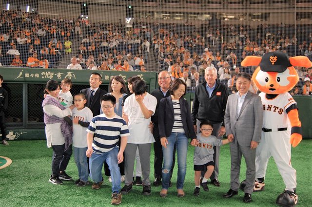 ゲーム前のグラウンドでは、この日、ハーマンインターナショナルが招待した就労移行支援事業所「ビルド神保町」の子供たちとの記念撮影が行われた。
