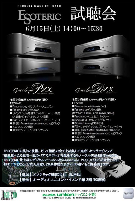 エソテリック「Grandioso P1X/D1X」試聴会、オーディオユニオンお茶の水で6月15日開催