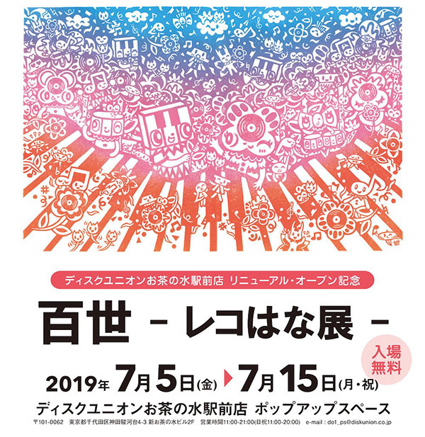 また、ポップアップ・イベントスペースも新規オープン。7月5日から15日までは、忌野清志郎さんの長女で消しゴムハンコ作家・百世さんの個展「百世 -レコはな展-」を開催。原画の販売や、描きおろしのレコードをモチーフにした様々な限定グッズの販売が行われる。