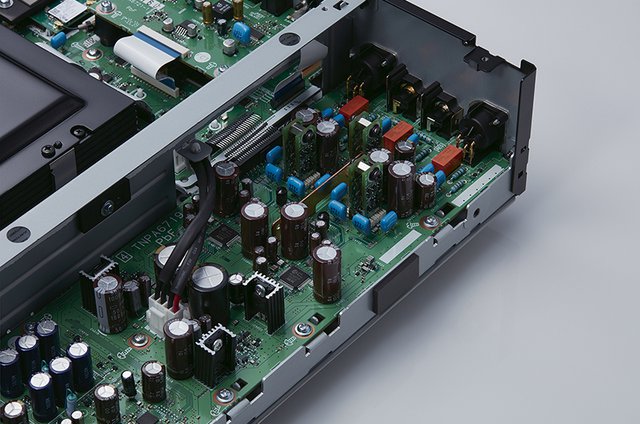新生テクニクスのデジタルプレーヤー開発で培った高音質再生技術を投入し、音質向上にも注力。D/Aコンバーターには旭化成エレクトロニクスの「AK4497」をL/Rに1基ずつ、デュアルモノラル構成で搭載。L/R独立した伝送構造に加え、左右対称レイアウトとすることで相互干渉低減を図っている。またICへの電源供給は、5つの電源を用途ごとに切り離して個別に供給。特にクロック用の電源には、独自のバッテリー駆動による低ノイズ電源(Battery Driven Circuit System)を用いることで高精度なD/A変換を実現したという。