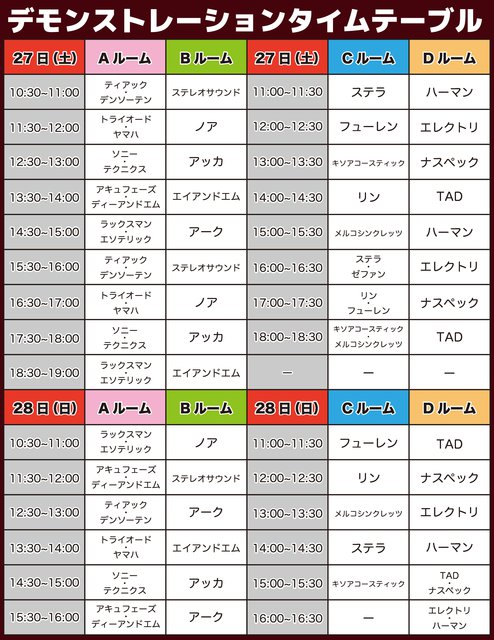 デモンストレーションは1コマ30分で、27日は1ルームあたり9コマ、28日は1ルームあたり6コマが行われる。出展ブランドは以下のとおり。