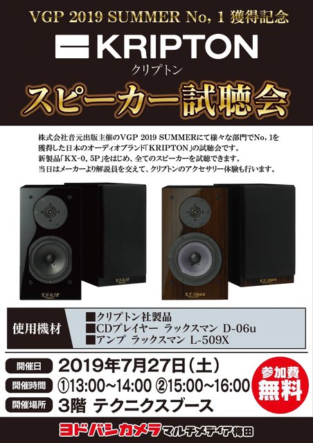 クリプトンは、ヨドバシカメラ マルチメディア梅田 3Fにて、「VGP 2019 SUMMER」で各賞を受賞したKRIPTONブランドの試聴会を、7月27日(土)に実施する。試聴会は2回実施され、1回目は13:00〜14:00、2回目は15:00〜16:00となる。