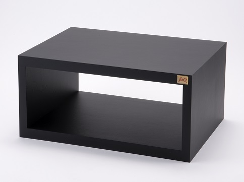 シンプルな箱型形状のラック。天板部と底部はそれぞれ34mmの厚さで、振動を電気エネルギーに変換して制振する独自の制振素材「fo.Q(フォック)」の1mm厚シートを含む7層のサンドイッチ構造を採用する。またサイドの板は強度を重視した合板を主体に、メラニン材で仕上げている。