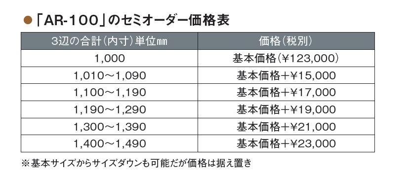 カラーは黒革調(ブラック)、ウォルナット調(ナチュラル)、ウォルナット調(ダークブラウン)の3種類を用意。価格は前述の通りセミオーダー制となっており、内寸法の3辺の合計によって価格が決まっている。詳細は下記の表をご参照いただきたい。