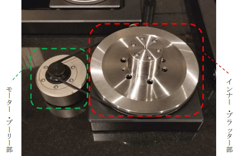 一方インナープラッターには、耐摩耗性や耐腐食性に優れた砲金製のダブルベアリングを採用。2つのネオジウムマグネットによって浮上させているほか、ダブルベアリングのハウジングをオイルで満たすことで、滑らかさが長時間維持できるよう配慮した。動力を伝えるプーリーの位置を変更し、ベルトのテンション調整をすることも可能。