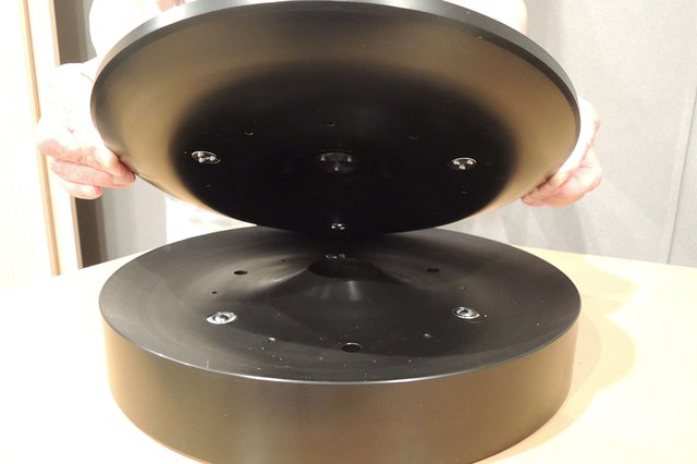ターンテーブルのTopasは、回転軸にマグネット・フローティング機構をもつ。またキャビネットには御影石とアルミニウムでシリコンフィルムを挟んだ3重構造とすることで、共振や振動を防いでいる。