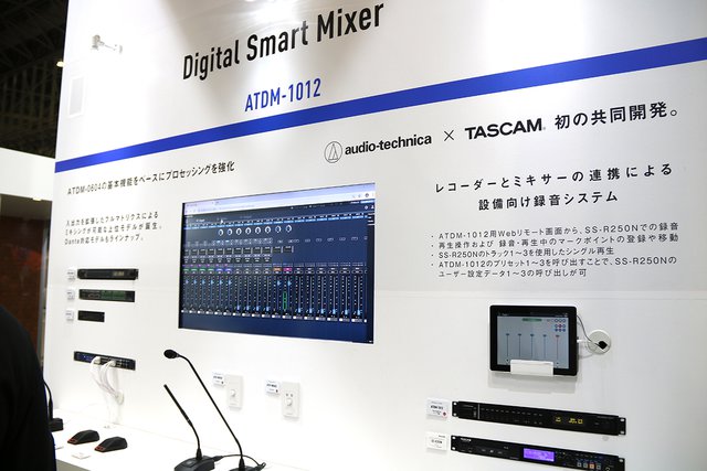 オーディオテクニカは、ティアックの業務用機器ブランドであるタスカムと共同開発した設備向けミキサー「ATDM-1012」を出展。