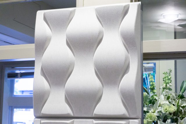 アコースティックスタンドArt Standは、デザインを意識したルームチューニングアイテム。パネルにはスウェーデンOffect社の業務用アコースティックパネル「Soundwave」を採用し、これをオリジナルデザインのアルミフレームに装着している。