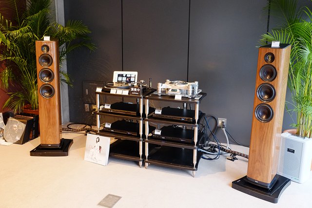 アクシスのブースでは、同社が取り扱う各種ハイエンドオーディオ製品が並ぶ。特にFYNE AUDIOの2.5ウェイ・フロア型スピーカー「F502 SP」と、2ウェイ・ブックシェルフ型スピーカー「F701」は年内発売を目指す最新モデルとなり、会場でその音を確認することができる。