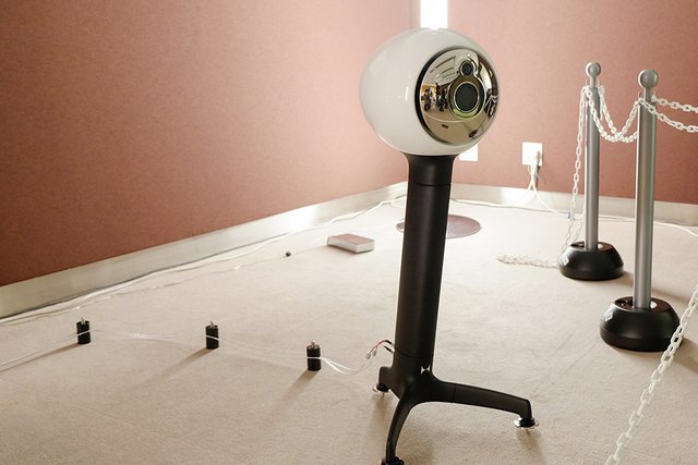 フラグシップスピーカー「14EH」(480,000円/ペア・税抜)が小型であり、低域を無理に誇張しない音作りであったことから、それを補うマッチングを想定して登場するサブウーファー「Foundation 500」もまた球形だ。Scanspeakの8インチユニットを左右に各1基搭載する構成で、鋳鉄を用いるため直径32cmながら質量25kgとなる。Foundation 500は速度の早い低音を目指しているとしており、14EHと組み合わせた2.1chシステムの音を聴くことができた。