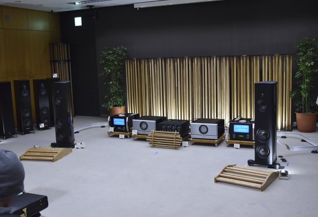 今年は同ブランドを代表するモデルである「HB-X1」を、片チャンネルあたり2本使用したダブルスタックシステムでのデモンストレーションがメインテーマ。これはオプションである「W STACK STAND」を使用することで実現できるもので、この「インターナショナルオーディオショウ」では初めての試みであるという。PASS LABのプリ、パワーアンプでドライブし、MERGING TECHNOLOGIES社のネットワークDAC等を使用してのハイレゾ音源を中心としたデモが行われている。
