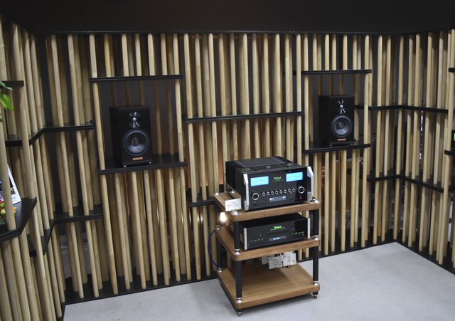 エレクトリのブースでは日本音響エンジニアリングも正式参加。同社のAGS(柱状拡散体)によるルームチューニングアイテムが例年以上にバリエーション豊かに展示され、実際のデモンストレーションも実施されている。ブース内には特注製品としてMAGICOの最新ブックシェルフ「A1」が埋め込めるスペースを設けたAGS(柱状拡散体)を展示。