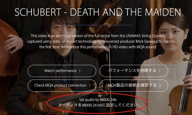 ひとつ注意点として、Macならば「オーディオMIDI」設定、Windowsならばサウンドデバイスの「プロパティ」において、それぞれの再生ページに記載のある出力フォーマットに設定しないと、正しくMQAデコードがされない。たとえばUNAMAS「DEATH AND THE MAIDEN」ならば、出力設定を「48Hz/24bit」と設定する必要がある。これは、PCサイドでフォーマットの変換が行われてしまうと、MQAデコーダーが正しくMQAフォーマットを解凍することができないためである。
