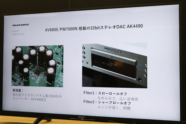 CD6006ではシーラスロジック製のDACを採用していたが、本機では新たに「AV8805」「PM7000N」といった上位機にも搭載されるAKMの「AK4490EQ」を採用した。USB接続で最大PCM 192kHz/24bit/DSD 5.6MHzのハイレゾファイル再生が可能になったことに加え、フィルター1(スローロールオフ)/フィルター2(シャープロールオフ)の切り替えが可能なデジタルフィルター機能も新たに搭載する。