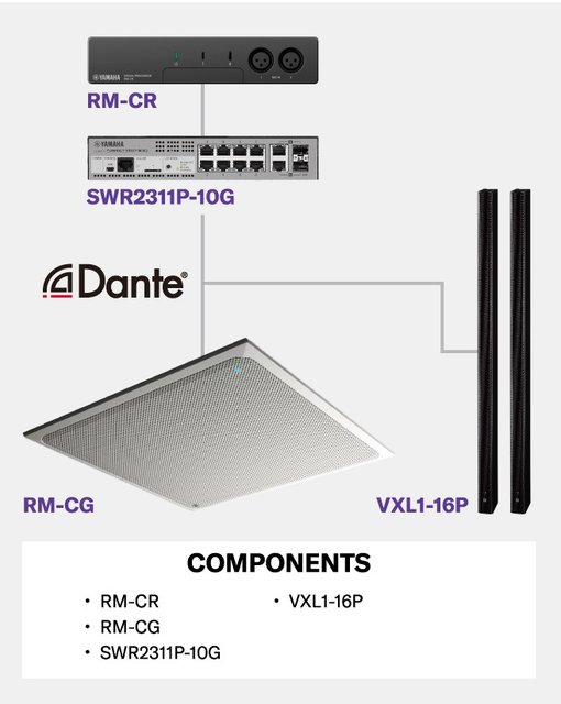 Danteは、LANケーブルで多チャンネルの音声を伝送できるオーディオネットワークの規格で、LANケーブルから電力を供給するPoE駆動も行える。プロセッサーやマイク、スピーカーなど、Danteを採用するオーディオ機器同士をLANケーブル1本で接続するだけで、自動的に相互認識やセットアップが実現できる。