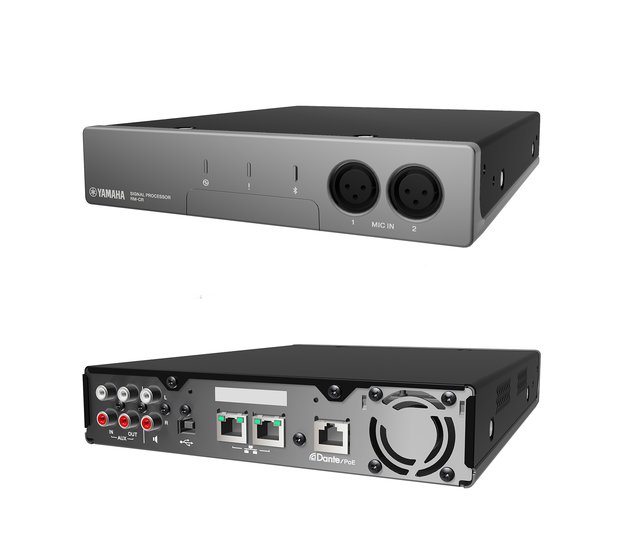 RM-CGのオーディオ入出力はDante in×1、out×2、PoEからの給電が可能。サイズは560W×560D×90Hmmで質量は5.6kg。