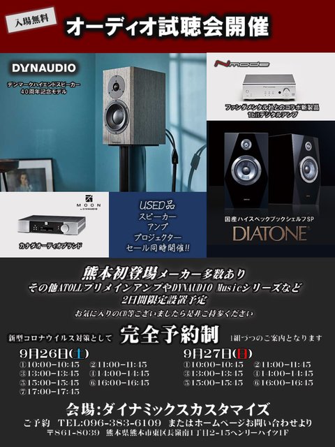 オーディオ&ホームシアター専門店のダイナミックスカスタマイズ(熊本市)は、9月26日(土)・27日(日)の二日間にわたり、“音楽でおうちエンタメ!”と銘打った「オーディオ試聴会IN熊本」を開催する。
