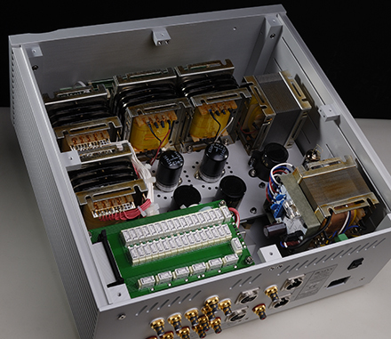 ボリューム回路(アッテネーター)に、自社設計・自社製造した高性能トランスを使用。2次側巻線に31個タップを設け、トランス巻線比を変えることにより31段階のボリュームコントロールを行う。抵抗器を使用する通常のアッテネーターでは、どんなに良い素子を使用しても原理上信号エネルギーの損失は避けられないが、トランス方式ではエネルギーのロス無くボリュームコントロールすることが可能だとアピールしている。