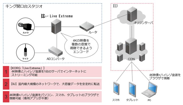 今回の実験は自宅にいながら高品位なサウンドクオリティのみならず、演奏家が居る空気感を共有しているような臨場感あふれる視聴体験を実現するための技術的チャレンジだとしており、コルグが開発した4K/ハイレゾ対応インターネット動画配信システム「Live Extreme」を使用し、キング関口台スタジオでの演奏を4K映像/PCM 192kHz/24bitのハイレゾフォーマットで、IIJのバックボーン、CDN(Content Delivery Network)を経由するかたちで配信。