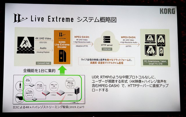 Live Extremeでは、音と映像を合わせるためにエンコーダー、ロスレス圧縮、サーバーへのアップロードまでを「KORG Live Extreme Encoder」1台で行う。2019年2月の配信実験では5台の機材が必要だったところを、基本的には1台で完結できるようになった(配信クオリティによっては2台必要)。機材を少なくすることでオペレーションをシンプルにできることや、なにかトラブルがあった際にもリカバリーが容易になるといったメリットがある。