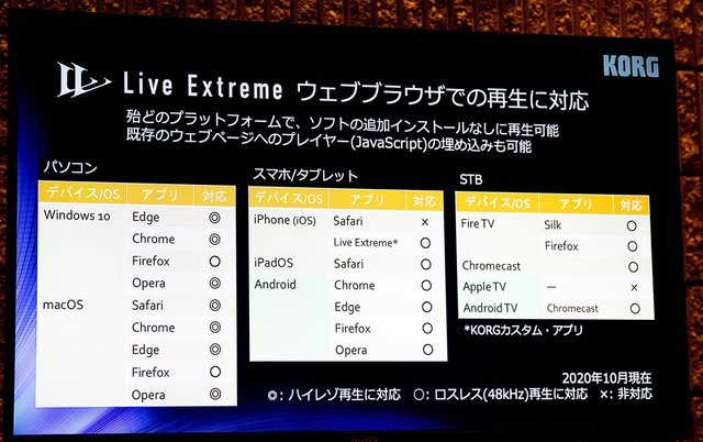 開発を手掛けたコルグの大石耕史さんによると、「Live Extreme」の最大の特徴は、“オーディオ・ファースト”であることだという。音声と映像を同時にストリームするためには、リップシンクといったタイミングを合わせる操作が必要になるが、このLive Extremeに関しては、「オーディオ」の高音質再生を優先とし、その音声信号に「映像を合わせる」形で実現されている。