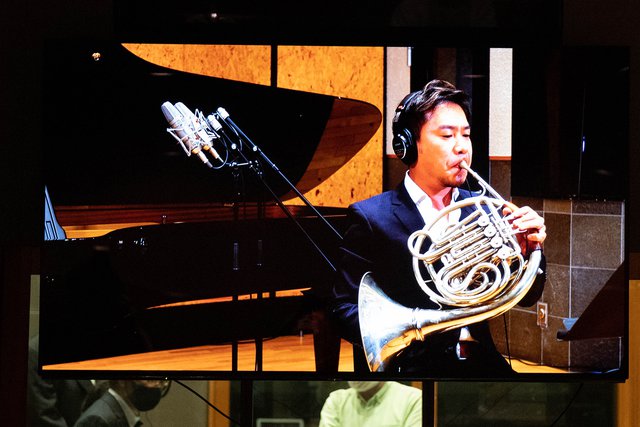 福川伸陽さんの演目は「マーラー:交響曲第5番」より、第4楽章アダージェット。しかも、それをホルン八重奏に編曲し、すでに福川さん自身が録音した7本のホルンに、リアルタイムで福川さんが8本目のホルンを合わせる形で演奏される。指揮についても福川さん自身がすでに動画撮影したものに合わせるという画期的な取り組みだ。