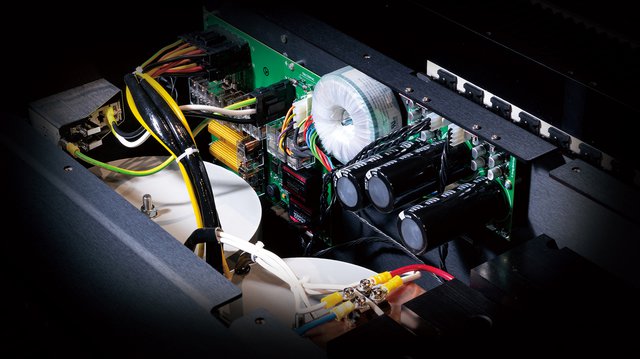 電源部には、47,000μFの平滑コンデンサー×6と、特別に電磁シールドを施した1,800VAのトロイダルトランスを2基搭載。コンデンサー間の接続はインピーダンスを下げるため高純度の銅製バスバーを使用、振動対策として約2cm厚の樹脂ボードを重ねている。