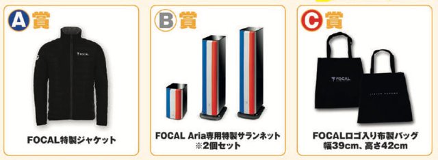 用意されるプレゼントは、FOCAL特製ジャケットやロゴ入り布製バッグ、Aria専用特製サランネットの3種類。それぞれプレゼント指定用のハッシュタグが用意され、投稿時に記載する。