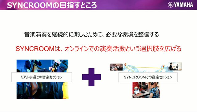 ヤマハの遠隔合奏に対する取り組みの歴史は古く、2005年ごろからスタートしていたが、当時の伝送情報量は限りがあり、MIDIでの伝送が限界だったという。その後光回線の充実などにより、2011年に「NETDUETTO」を公開、そして2020年6月に「SYNCROOM」として正式にリリースされた。実際に、ゴスペラーズなどのアーティストもSYNCROOMを配信に活用しているという。