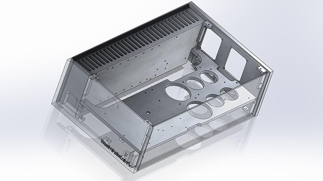 メインシャーシは、非常に精密なCNC加工を施した宇宙航空グレード6063アルミ合金製コンポーネントを2つ組み合わせた構造で、電源とその他の部位との機械的振動を分離。外部パネルは電源側に固定し、オーディオ帯域内の多くの微振動を吸収させる設計としている。